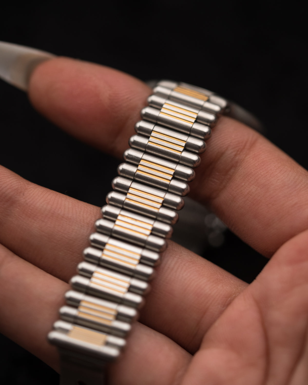 Bi-metal case with gold Roman numeral bezel in pristine vintage condition. The brushed steel surfaces remain well preserved with only light, age-appropriate wear visible on close inspection.