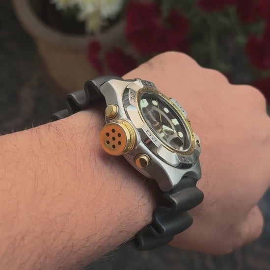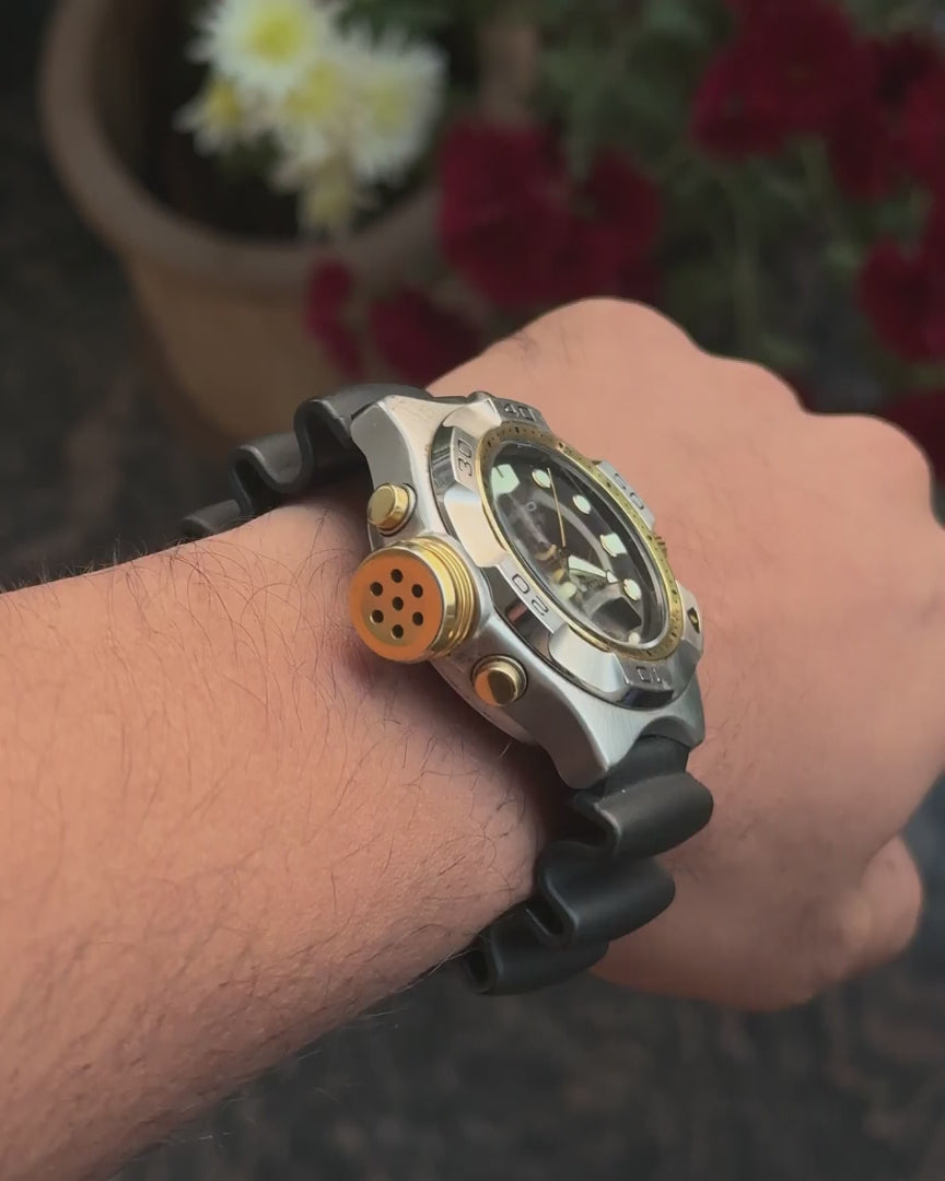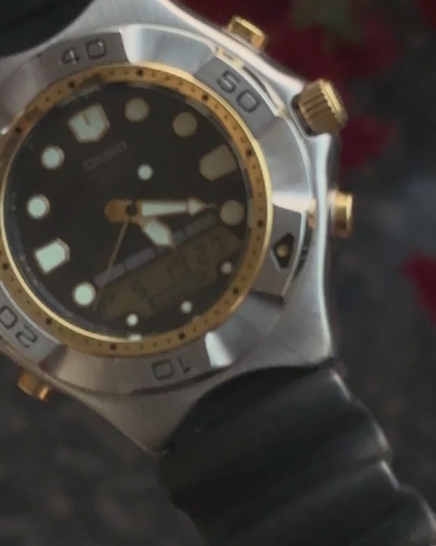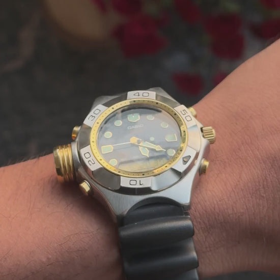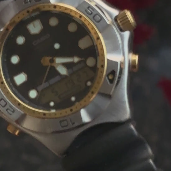Case Stainless steel case in very good vintage condition with visible, even surface wear consistent with use. Edges remain well defined. Gold-tone accents show light age-related patina. Bezel Original rotating bezel present. Engravings remain legible. Light wear visible, consistent with age. Dial Original black dial with luminous markers. Surface is clean and intact. Lume shows even ageing. Glass / Crystal Clear with light surface marks visible on close inspection. No cracks or deep scratches observed. Hands & Indices Original hands and markers, intact and well aligned. Luminous material present with uniform ageing. Strap Original black resin strap in very good vintage condition. Shows light signs of wear consistent with age but remains supple and wearable. Functionality Quartz movement in perfect working order. Digital, analog functions and depth meter operating as intended.