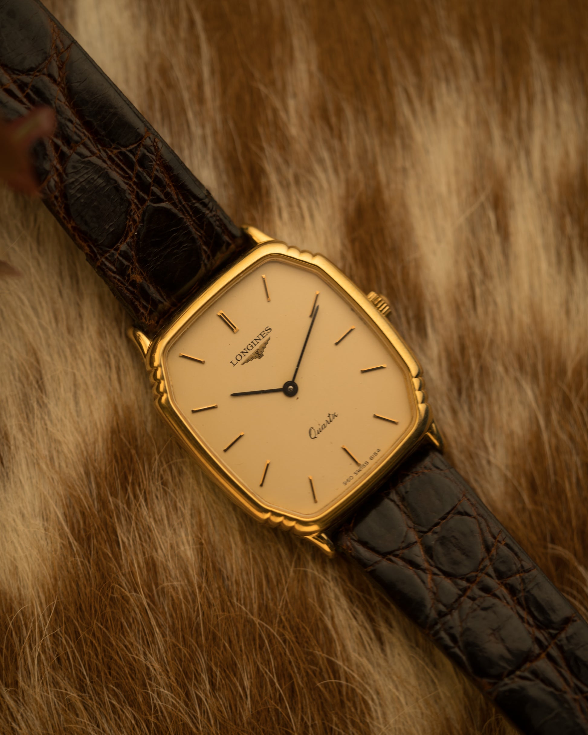 Paired with a textured leather strap, it reflects the refined minimalism that defined Longines dress watches of the era.