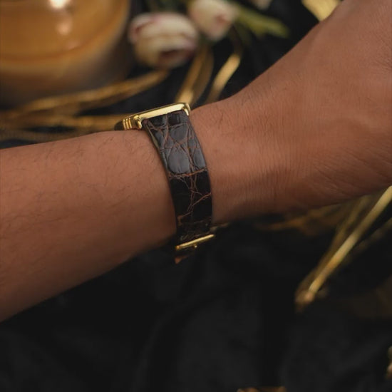 Gold-tone case in very good vintage condition with light, age-appropriate surface wear visible along the edges and lugs. The case retains sharp lines and presents well overall.