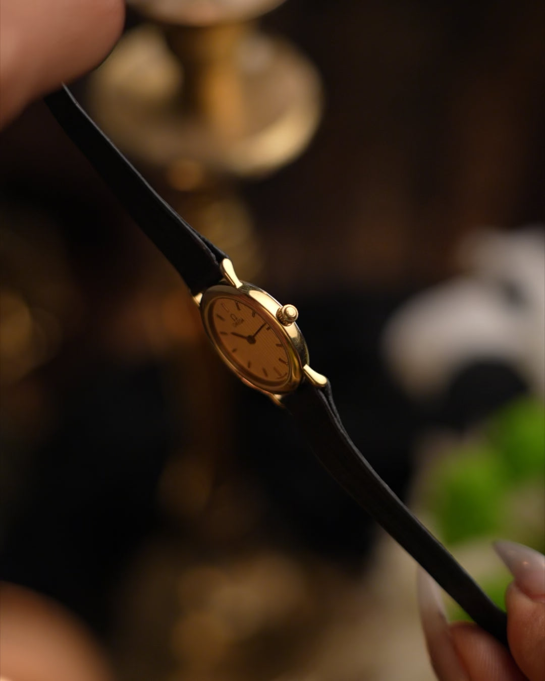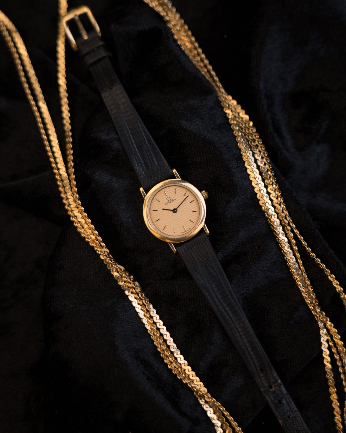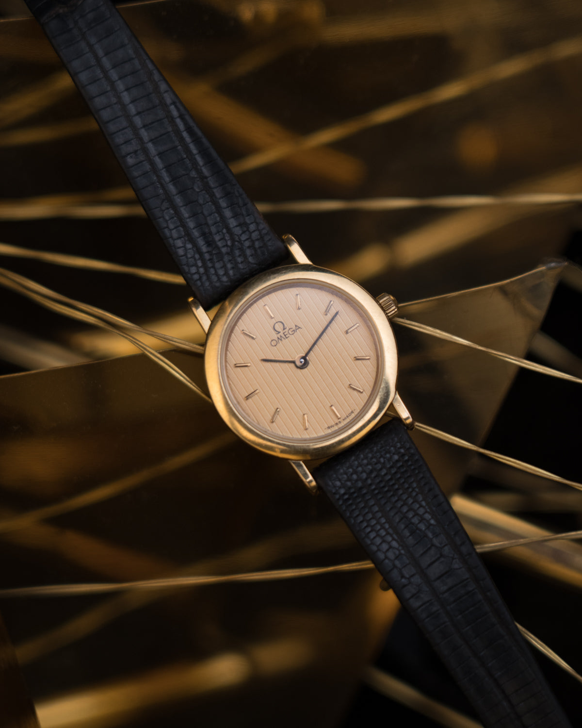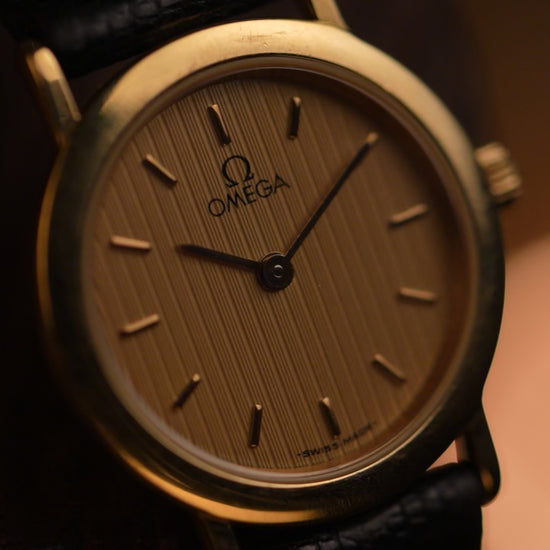 The slim gold-tone case and minimalist baton markers reflect Omega’s understated design language of the late 20th century.