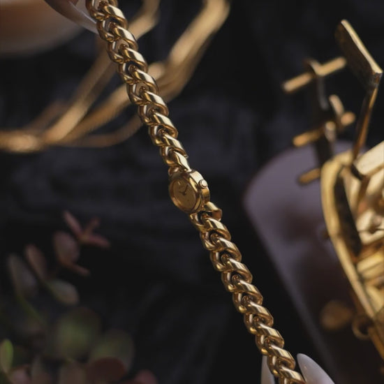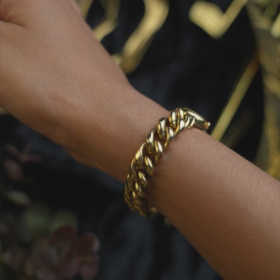 Integrated gold-tone chain bracelet with original clasp. The bracelet structure remains secure and well preserved with a strong sculptural presence.