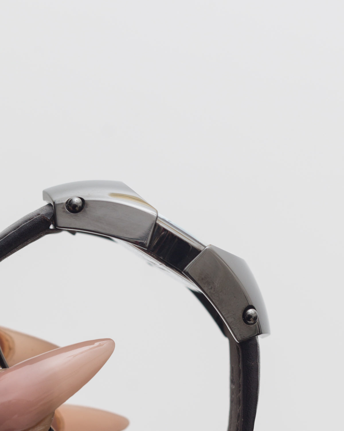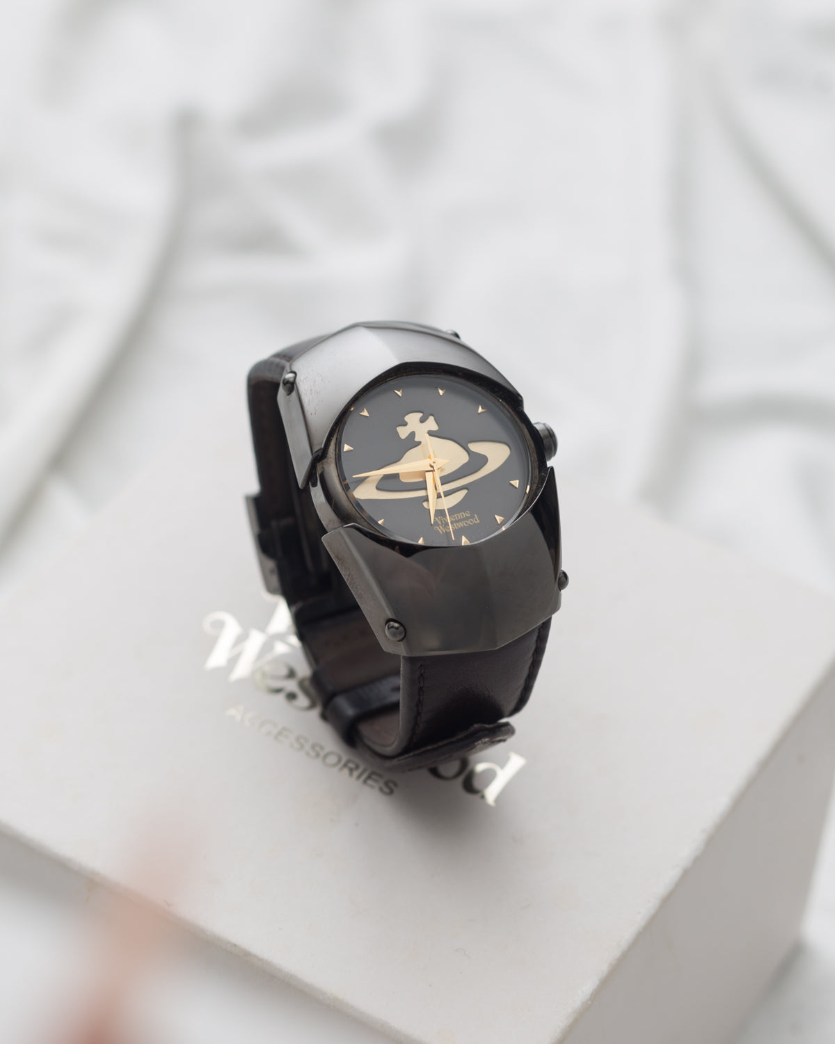 Case Black-toned case in excellent condition. Edges and surface present cleanly overall. Dial Graphic Vivienne Westwood orb dial, well preserved with no visible spotting or discoloration. Glass / Crystal Clear with no noticeable scratches. Hands & Indices Gold-tone hands and indices intact and well aligned. Strap Original leather strap in worn condition, showing creasing and surface wear consistent with age. Clasp / Hardware Signed Vivienne Westwood clasp with light wear present. Caseback Engravings remain visible. Light marks consistent with vintage handling. Functionality Quartz movement in perfect working order. Accessories Complete with original inner and outer box + papers.